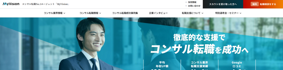 MyVisionは、コンサルティング業界への転職に特化したエージェントとして、特に未経験者のキャリアチェンジ支援で高い実績を誇ります。累計内定者数800名以上、大手コンサルティングファームへの内定率が業界トップクラスという実績を持ちます。
