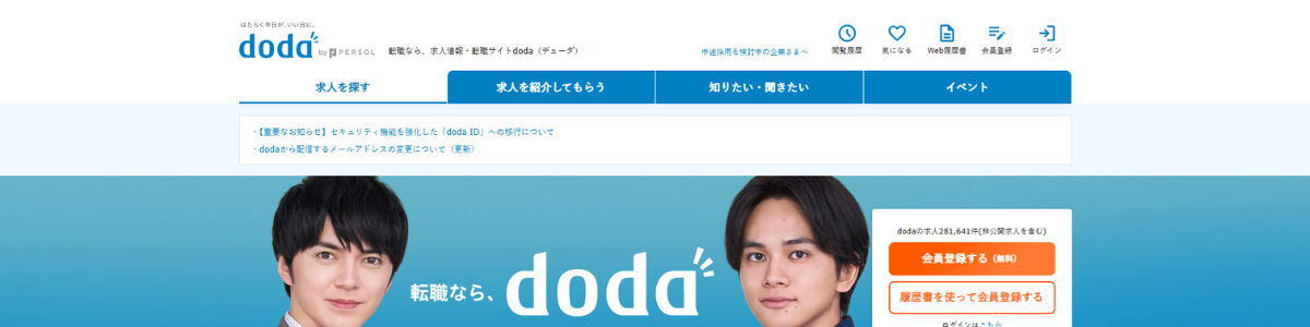 dodaは、パーソルキャリアが運営する国内第2位の規模を持つ大手転職サービスです。転職エージェントサービスと転職サイトの両機能を併せ持ち、約20万件の求人情報を保有しています。