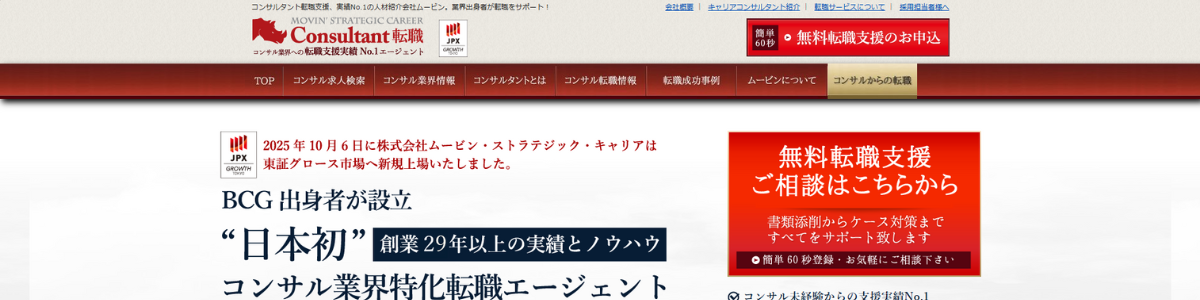 ムービンは、日本初のコンサル業界特化型エージェントとして25年以上の歴史を持つパイオニア的存在です。最大の特徴は、BCG、マッキンゼー、Bain & Companyなど戦略コンサルファーム出身者が直接転職支援を行う点で、実際のプロジェクト経験に基づいた実践的なアドバイスが受けられます。