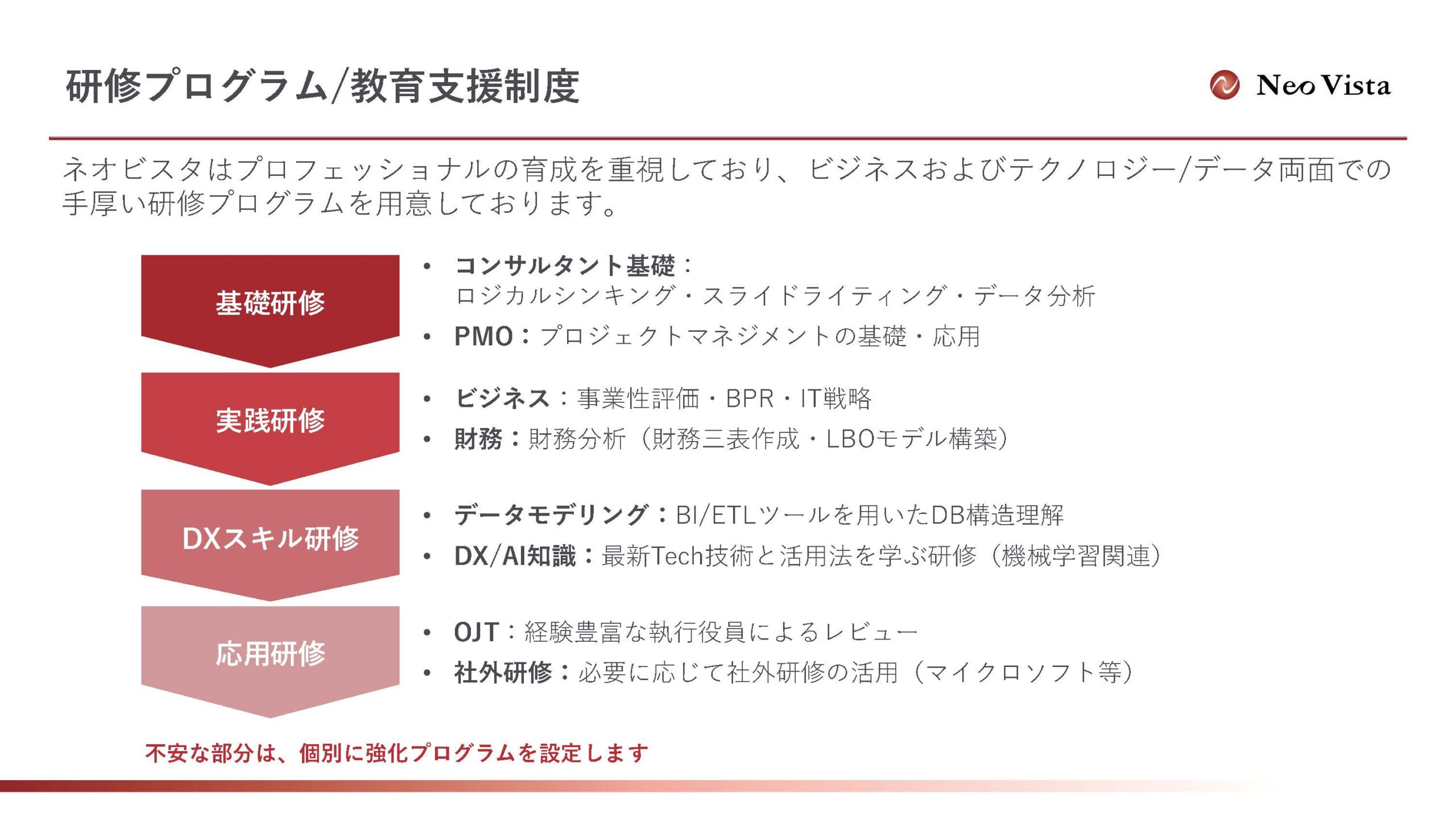 研修面でも、大手ならではのOJT方式を踏襲しつつも、ロジカルシンキングや財務分析、データモデリングなど、幅広い基礎力を身につけられる研修プログラムを整えています。財務とITの両方が分かれば、大抵の環境で食いっぱぐれない。そういうビジネスプロフェッショナルをネオビスタで育てていきたいというのが、私の想いです。