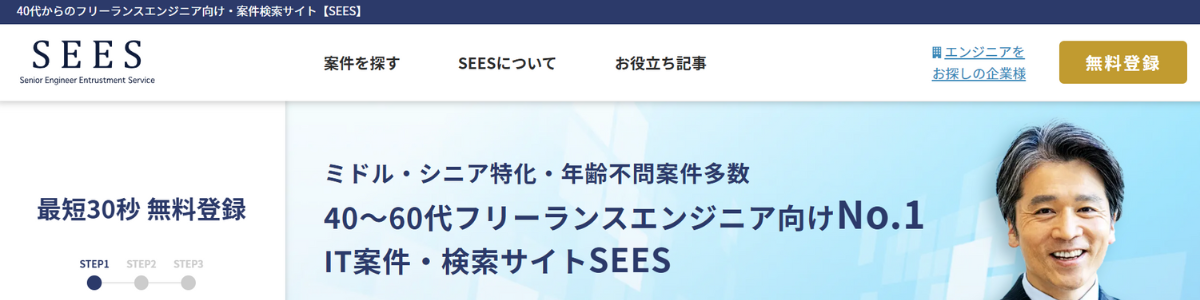 「SEES(シーズ)」は、40〜60代のミドル・シニア世代のITフリーランスエンジニアに特化した案件検索・紹介サービスです。他社では年齢がネックとなる世代でも、豊富な経験をアピールポイントとして活躍できる環境を提供しています。