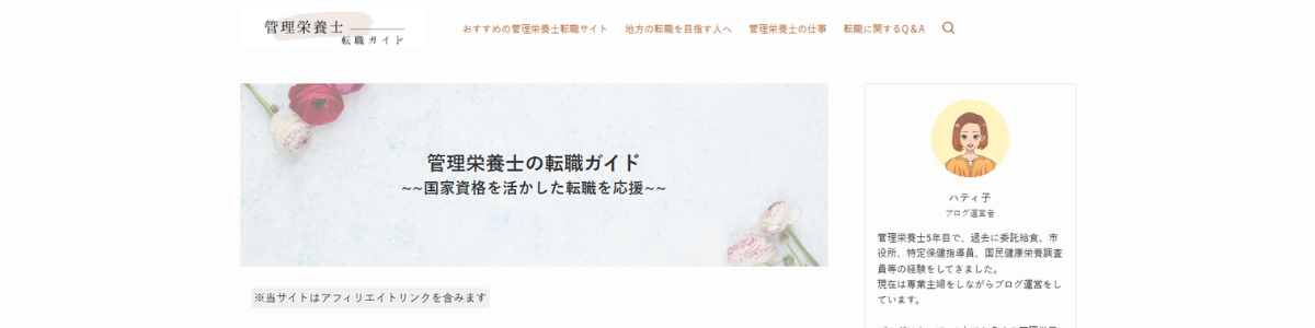 「管理栄養士の転職ガイド」は、管理栄養士として5回の転職を経験した筆者が運営する、管理栄養士の転職に特化した情報サイトです。国家資格を活かした転職を支援することを目的としています。病院、行政、老人施設、食品メーカー、保育園など職場別の仕事内容を詳しく解説し、各職場の特徴やQ&Aをまとめています。
