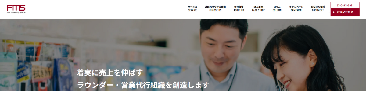 「株式会社フィールドマーケティングシステムズ(FMS)」は、1982年創業、40年以上の実績を持つラウンダー・営業代行専門会社です。本社を東京都中央区日本橋に置き、札幌、名古屋、大阪に支社を展開。「現場主義」をモットーに、店舗巡回サービスを中心としたフィールドマーケティングソリューションを提供しています。