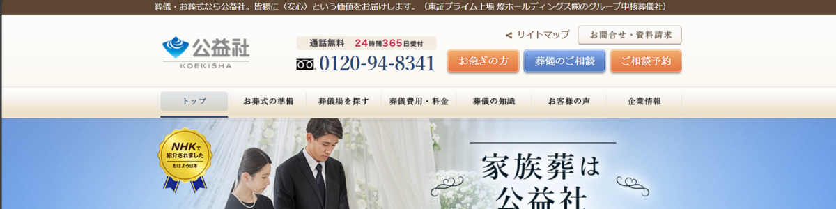 「公益社」は、東証プライム上場の燦ホールディングス株式会社グループの中核葬儀社です。首都圏(東京・神奈川)と近畿圏(大阪・兵庫)を中心に葬儀・お葬式サービスを提供しています。